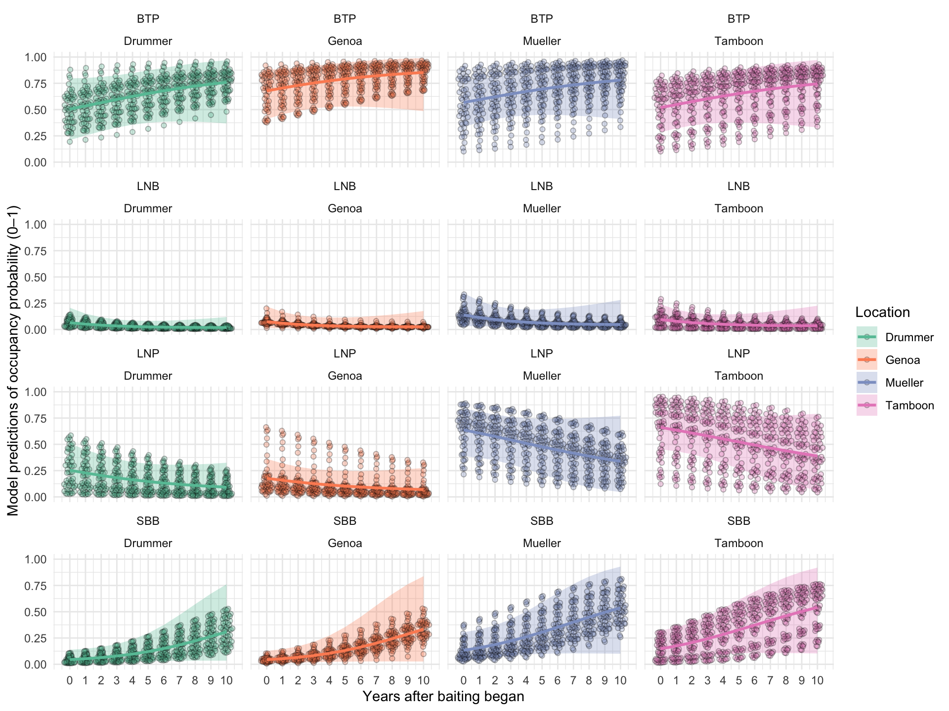 An analysis of native species and introduced predator occupancy at Southern Ark monitoring sites before and after the 2019/2020 fires.